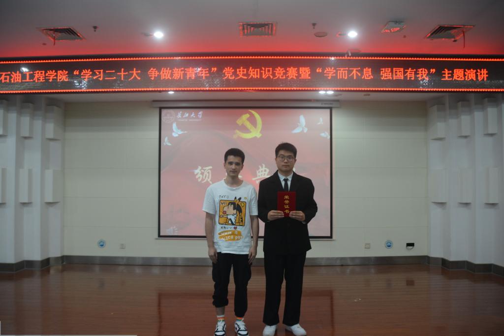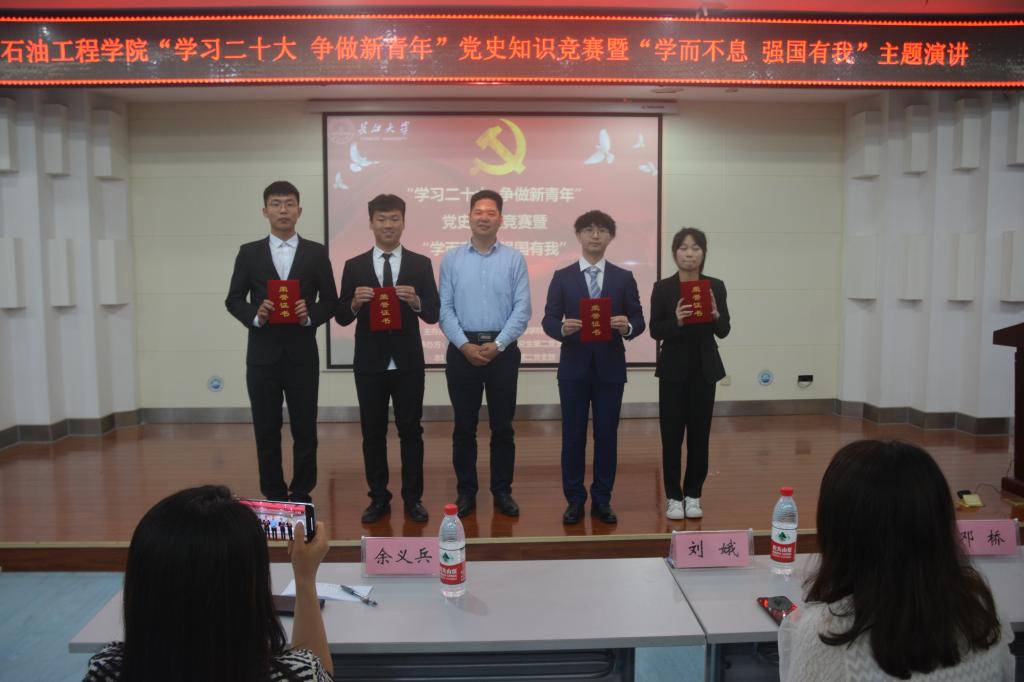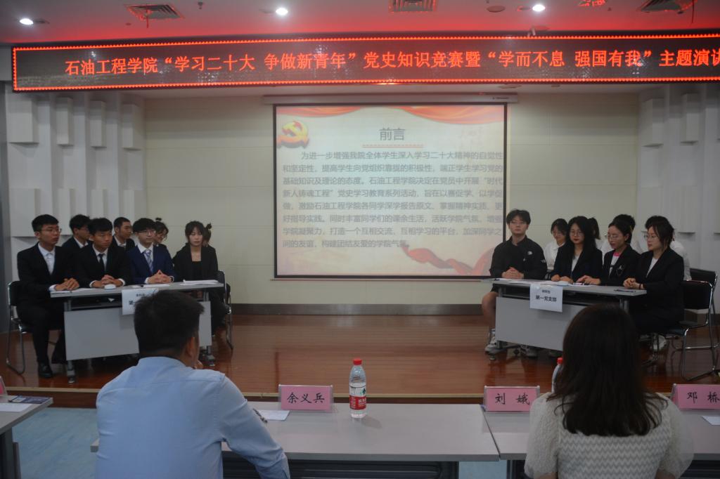 于图书馆报告厅顺利开展“学习二十大 争做新青年”党史知识竞赛暨“学而不息 强国有我”主题演讲活动。学院党委副书记刘娥、油气井工程系教工党支部邓桥、余义兵,学工办史永波、郭冀宁、周晓峰、陈金建老师莅临本次比赛现场。