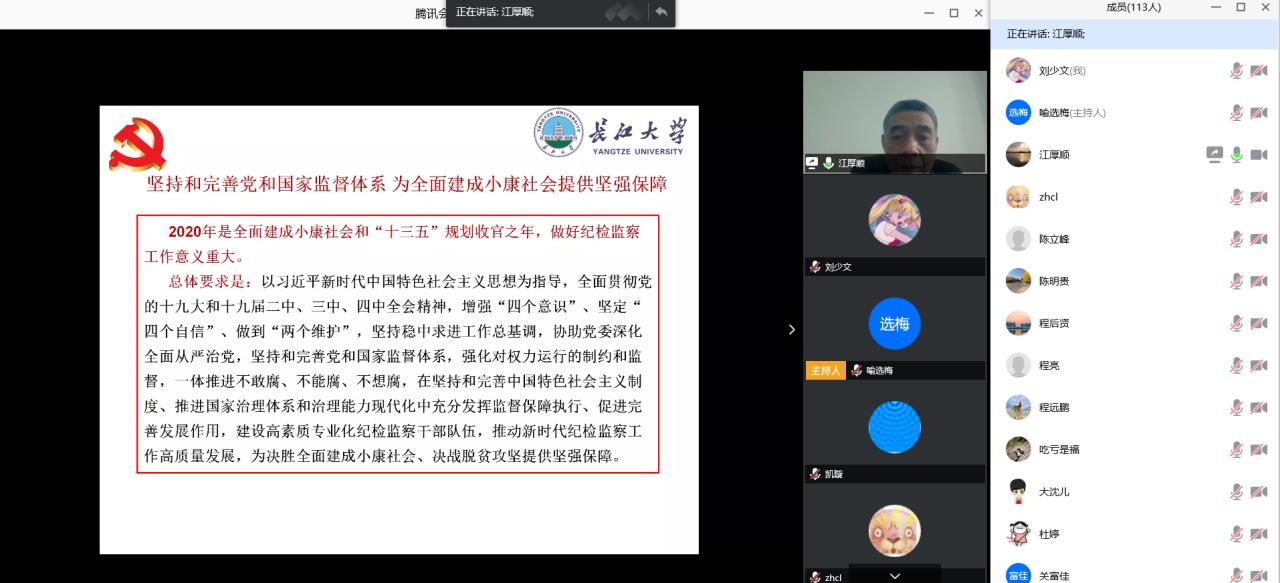 党委书记张光明代理全体教师学习了习近平在统筹推进新冠肺炎疫情防控和经济社会发展工作部署会议上的讲话、习近平主持中共中央政治局常务委员会会议讲话精神、习近平在决战决胜脱贫攻坚座谈会上的讲话和习近平在湖北省考察新冠肺炎疫情防控工作时的讲话等系列重要讲话精神,在线学习了赵乐际在中国共产党第十九届中央纪律检查委员会第四次全体会议上的工作报告和省纪委十一届四次全会精神,强调要充分发挥纪检监察职能作用,为我省全面建成小康社会提供坚强保障。对于学校各项事业发展和近期工作,全体教师在线学习了中共老司机