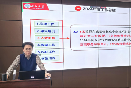 院长宇波代表学院班子作2024年度工作总结与2025年度工作计划汇报。他全面回顾了过去一年学院在党建工作、平台建设、人才引育、教学工作、科研工作和学生培养等方面取得的成绩,并明确2025年工作目标和计划。他指出,2025年将持续推进强院机制顶层设计,完善委员会决策机制,规划、传帮带、培训、激励、考核与改进机制,以及公共事务共理机制,稳步推动有组织的人才引育、教学、科研、平台建设和学生培养各项举措落地落实、见行见效。他希望全院教职工秉持“诚信感恩、团结协作、奋进创新、共筑一流”的理念,齐心协力,锐意进取,实干担当,共同谱写石油与天然气工程学科发展的新篇章。