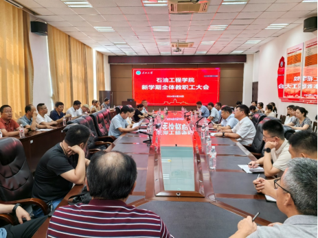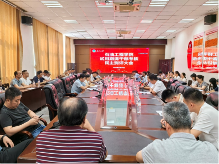 在石油科技大楼B113会议室召开试用期满干部考核民主测评大会暨全院教职工大会,武汉校区党工委书记崔青山一行出席会议。学院全体教职工参加会议,会议由院党委书记张伟主持。