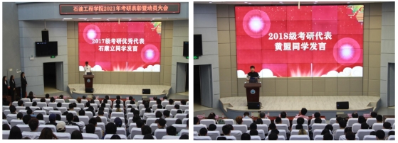 2021年考研表彰暨动员大会近日于石油科技大楼学术报告厅顺利举行。学院全体领导、教师代表、2017级考研优秀代表以及2018级全体本科生参加了本次活动。活动由学院党委副书记刘娥主持。