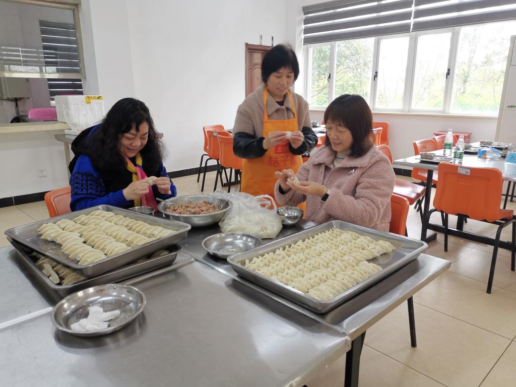 (图12.韩书记(左一)和艾主任(右一)为学生亲手包饺子)