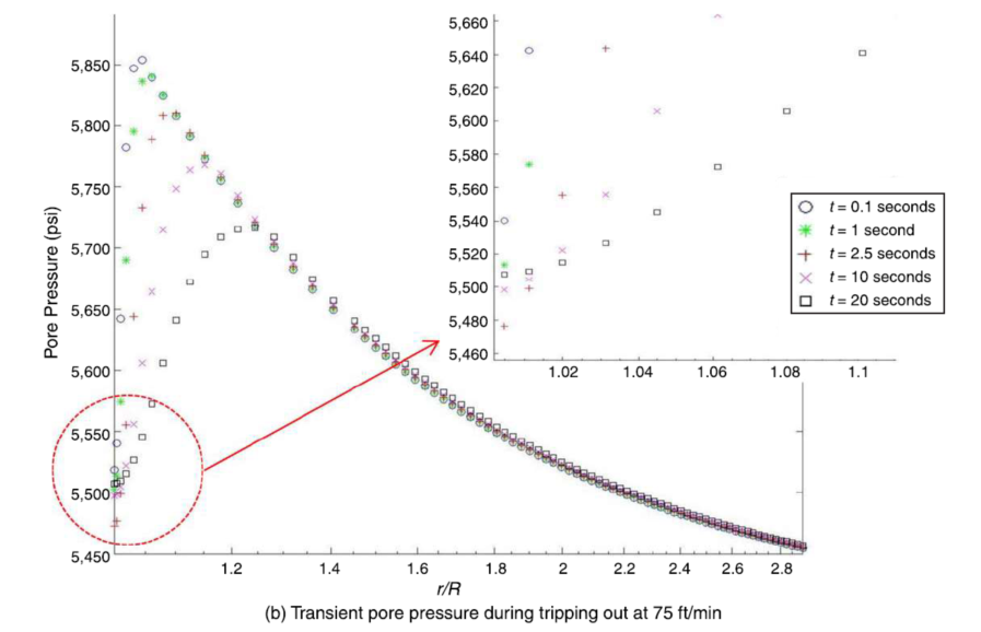 智能钻井技术项目组2018年在《SPE Journal》上发表的论文“Transient Coupling of Swab/Surge Pressure and In-Situ Stress for Wellbore-Stability Evaluation During Tripping”是业内首次进行起下钻过程中瞬态井眼压力变化对井壁岩石孔隙压力影响的研究。该论文将井眼内的环空流、井壁周围岩石内的渗流、岩石应力场三者相耦合,研究了起下钻过程中的动态抽吸/激动压力与井壁周围岩石内的孔隙压力以及岩石有效应力场变化之间的关系。论文还提供新的钻井过程中环空流-渗流-应力场之间的耦合计算方法,提高了传统井壁稳定分析的准确性,而且为钻井过程其它方面关于流-固耦合的应用开拓了思路。