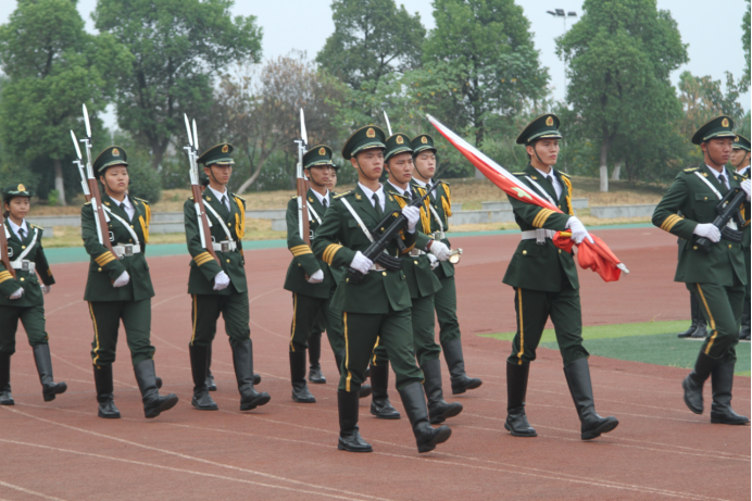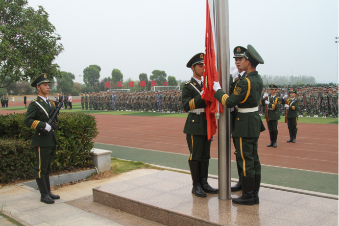 武汉校区2019级全体新生在足球场上举行升旗仪式。朝阳吐辉,清风送爽,同学们精神抖擞地站着军姿。