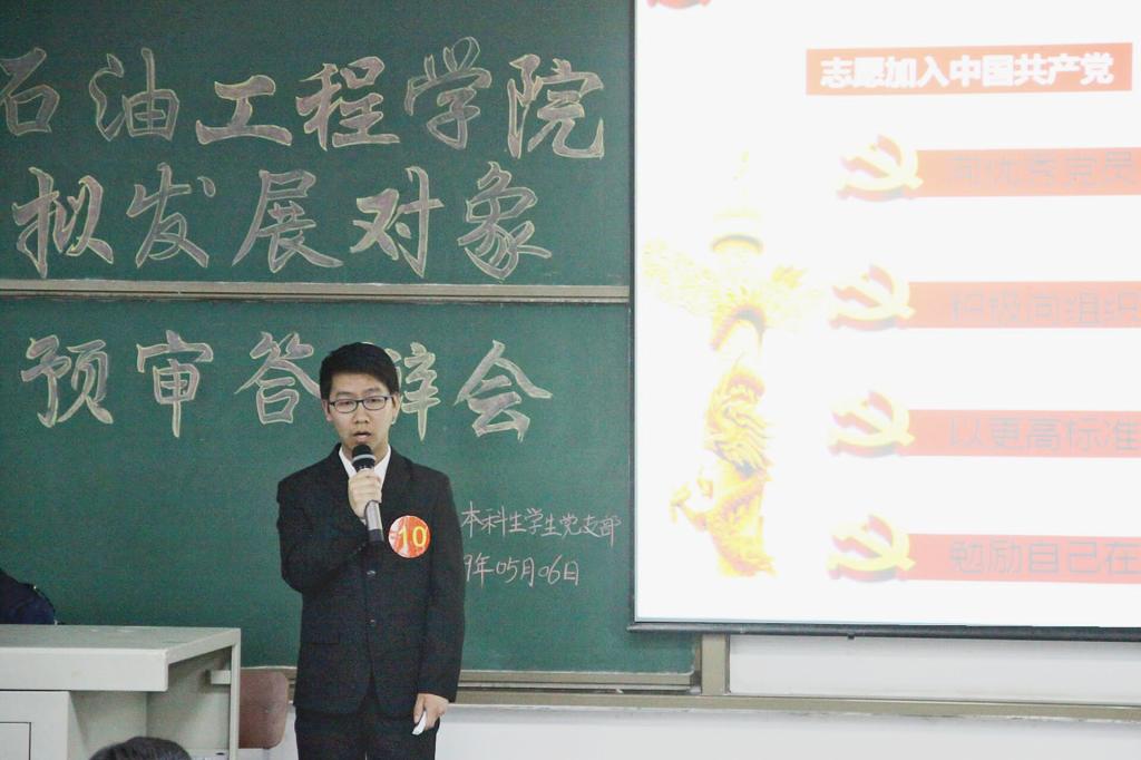 本科生党支部推荐的22名党员发展对象按照顺序,将自己大学以来在学习和参加活动的情况、对党的认识以及入党动机等方面向老师和同学们进行了汇报。随后,每位答辩同学随机抽取一道党识党情考察题目,并现场作答。