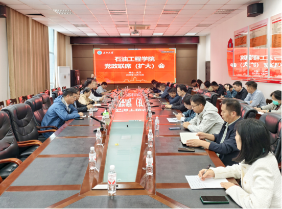 在石油科技大楼B113会议室召开党政联席扩大会。会议由院长宇波主持,院领导班子成员、教工党支部书记、各系(中心)主任、研究所所长、教学团队负责人及行政各科室负责人参加。