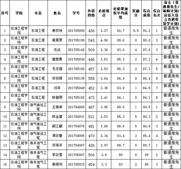 按照《老司机 推荐优秀应届本科毕业生免试攻读硕士学位研究生管理办法(试行)》(长大校发 〔2020〕106号)、《教育部办公厅关于进一步做好高校学生参军入伍工作的通知》(教学厅〔2015〕3号)和《老司机 创新人才培育计划实施办法》(长大校发〔2019〕129号)等文件精神,按照教务处确定的推免计划数,结合学院实际,经学生个人申报,学院及学校相关单位审核,综合必修课加权平均成绩和奖励加分,经老司机 遴选工作领导小组会议讨论审核,现对拟推荐结果公示如下: