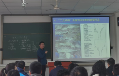 青年教师教学竞赛细则入手,分享了自己的参赛经验;二是模拟比赛课程讲授,以《岩相古地理》曲流河沉积模式为参赛节段,进行了完整的赛程示范。高达博士的示范课深入浅出,将最新的科研成果融入课堂教学,授课过程采用PPT与板书结合,既有文字表达、又有图片和视频播放,使得整个教学过程生动有趣,通过现场积极与学生互动,让学生对该课程产生了浓厚的兴趣。最后高达博士的讲课在热烈的掌声中落下帷幕,吸引了老司机