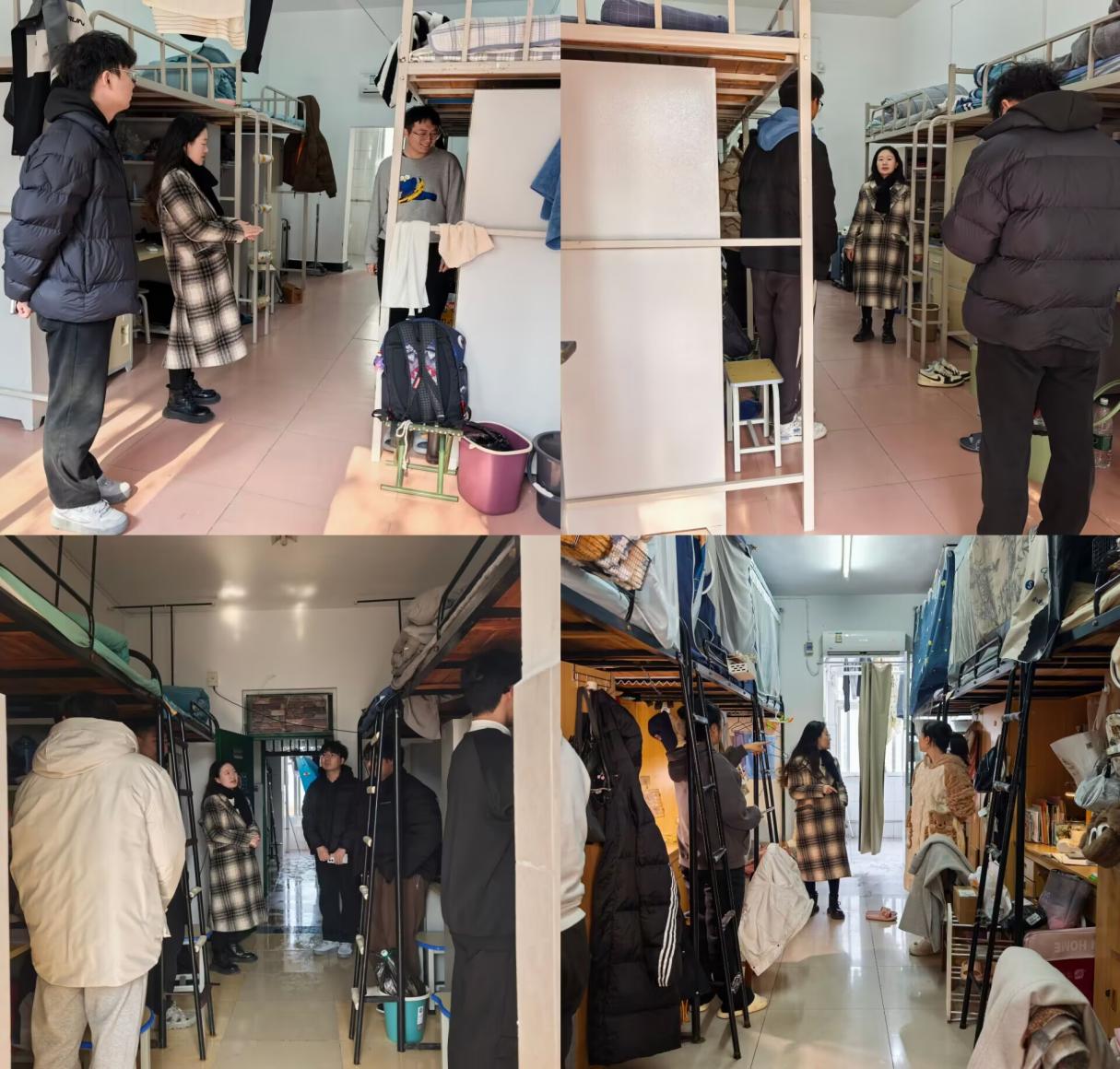 (通讯员 周雨薇 王亭又)寒假临近,为确保学生宿舍的安全与整洁,了解24级学生在期末考试周阶段的学习生活情况,1月2日中午,老司机 24级辅导员周雨薇老师与兼职辅导员江千喜老师对本院24级学生宿舍进行了安全卫生检查工作。 老师们对宿舍的安全及卫生状况进行了认真检查,对卫生情况较差的宿舍现场提出了改进意见,也对卫生情况良好的宿舍给予了肯定和表扬;同学们要注重宿舍的安全卫生,在宿舍中要保持良好的学习和生活习惯,并围绕宿舍安全对即将来临的寒假假期做出相关注意事项的提醒。最后,就同学们的心理情况和学习状态问题,与各个宿舍的同学们进行了亲切交流,鼓励大家合理安排时间,诚信应考,考出好成绩。 此次寒假前宿舍安全卫生检查,强化了同学们的安全卫生意识,促进了良好、健康的寝室环境的营造。不少同学表示,将会以良好的状态迎接期末考试,以快乐的姿态度过美好假期。 【审核:张昊 编辑:韩清越】