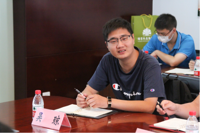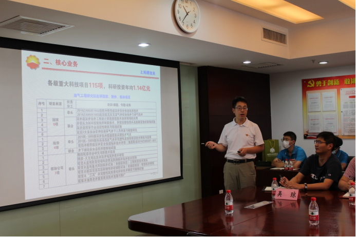 图为曹立虎主任向“黑油”实践队展示塔里木油田近年来的科技成果。通讯员 陈金建 摄